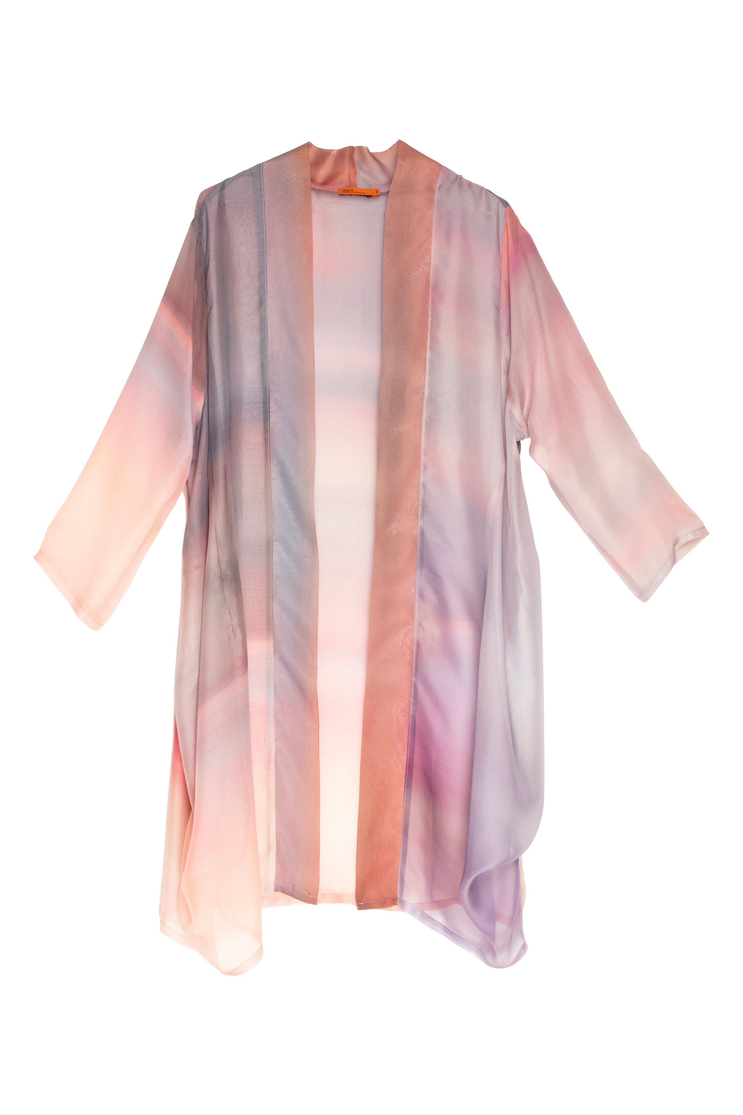 In stunning printed silk, this lightweight overpiece can be worn over almost anything for when you need that finishing piece. The magnificent combination of pinks, blues and purple in the print allow you to match this jacket over a variety of base colours. Whether for a special event or work, this style is the perfect cover up when you need a statement piece. Pair it with a simple top and pant for a laid back look, or wear it over a dress for a spectacular event outfit.