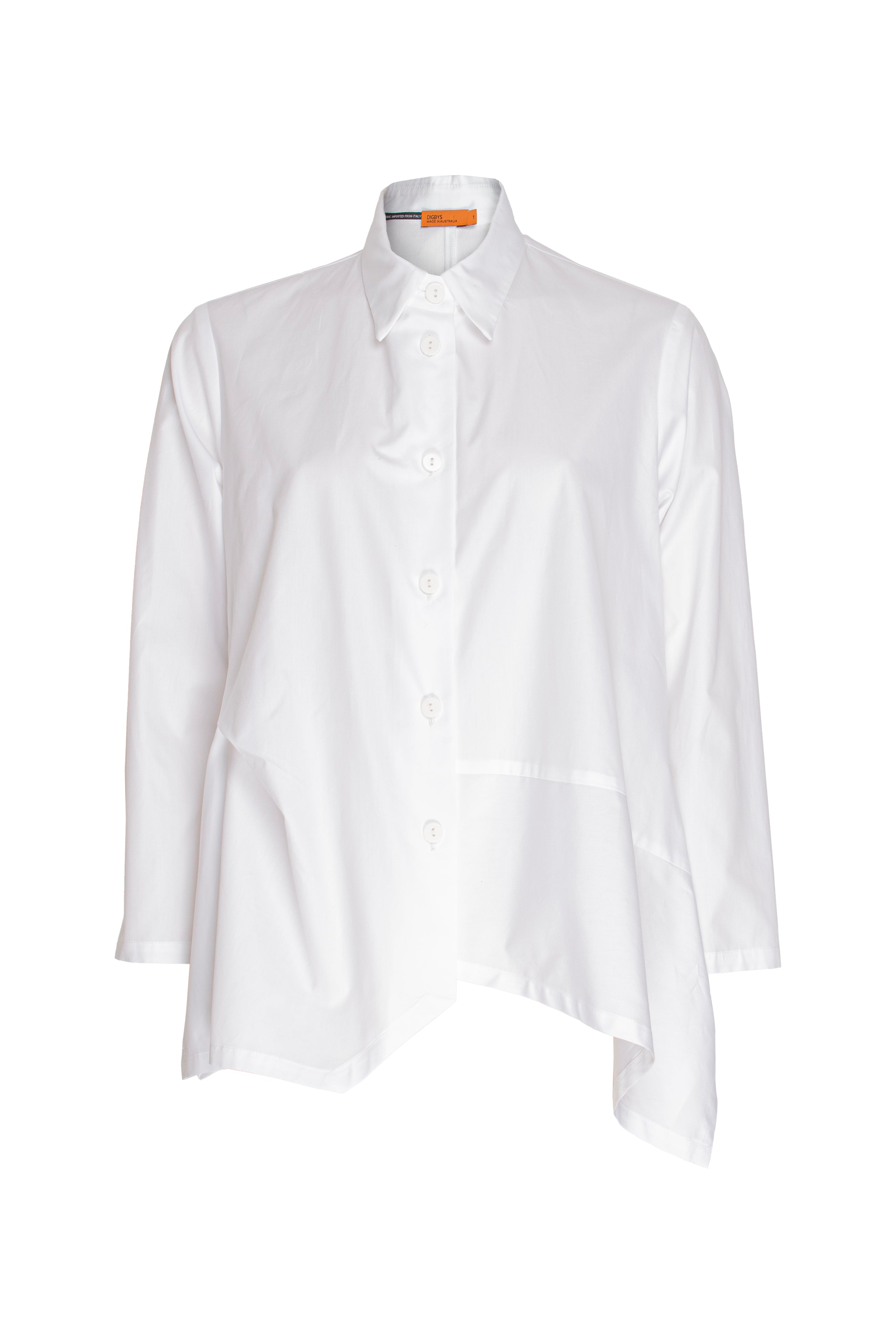 Asymmetrical angled panels elevate this shirt to a new level combining crisp cotton with a modern edginess. With tuck detail in the front and back panels, this shirt offers much more than your standard shirt. Wear it for work under your favourite suit, layer it over a singlet and skirt, or wear it simply with the sleeves rolled up over a pair of jeans for an easy yet stylish look.