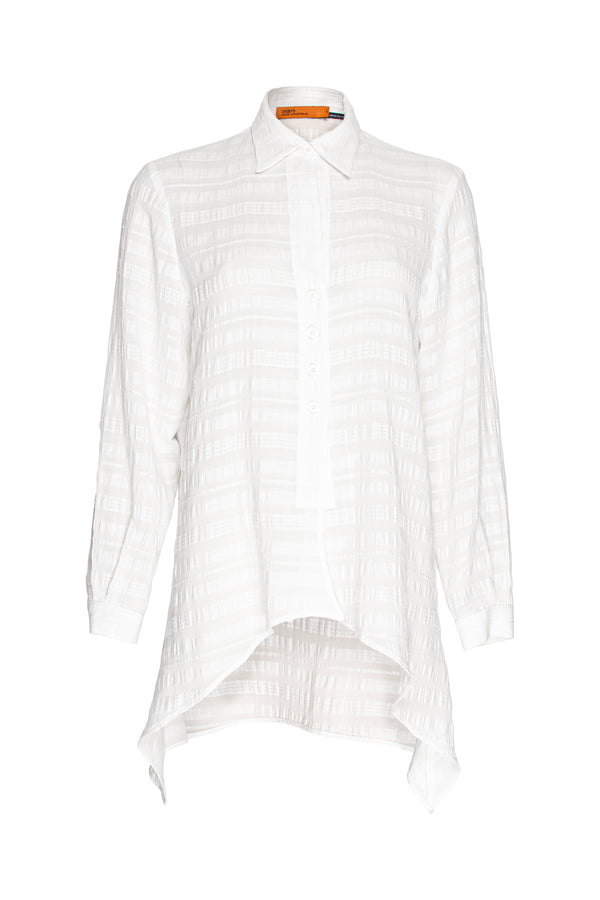 A classic shirt with self stripe woven interest. Perfect mid thigh length with uneven hem interest. Wear over jeans or pants for work or every day. An essential addition to any wardrobe. DETAILS Available in Cream Pressed collar 4 Button...