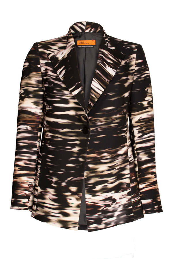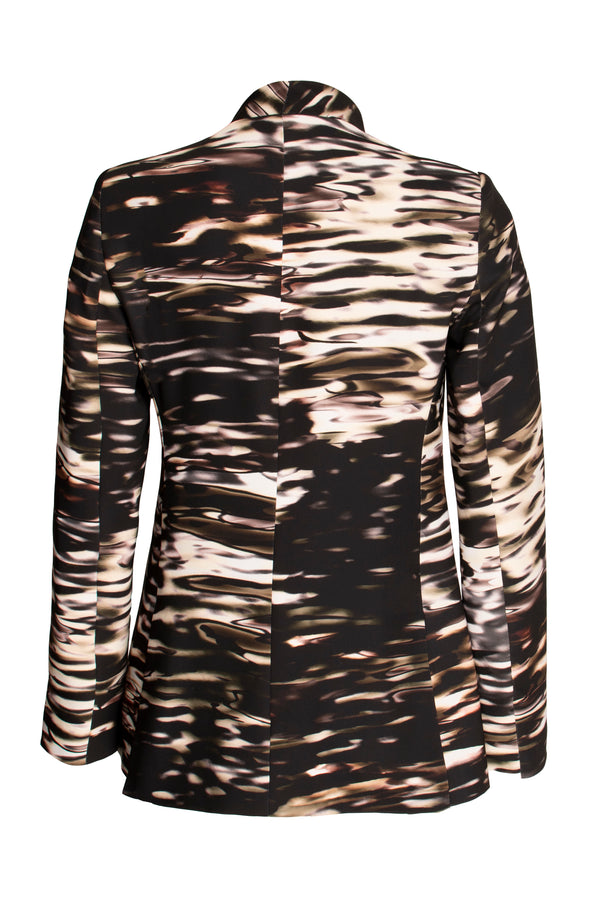 Elegant and striking print in this high button asymmetric closure gives this jacket a special place in your wardrobe. Worn open for a different look with high peak reveres and stand up back collar. Wear it with classic black pant available in two styles or the panel swing...