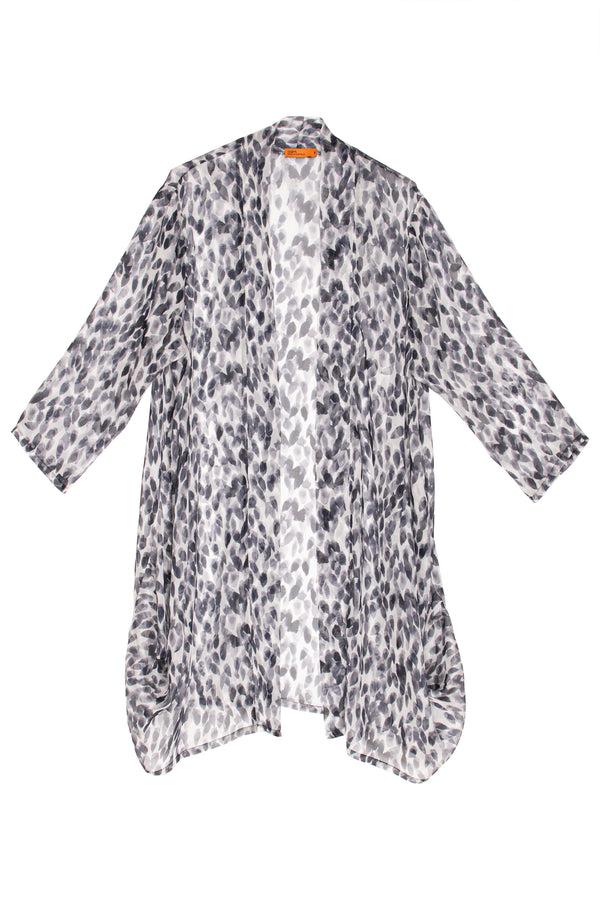 In stunning printed silk, this lightweight over piece can be worn over almost anything for when you need that finishing piece. The shades of blue/navy in the print allow you to match this jacket over a variety of base colours....